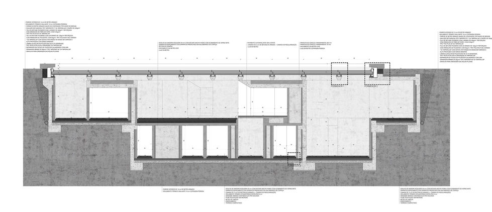 The impression and movement defined by the diffuse light entering through the water-mirror ceiling of the buried buildings or, the reduced number of openings of the existing buildings on the surface projected into the concrete gray walls, defines the sober character of the building evoking the changing perception of time in the cinema through the light.